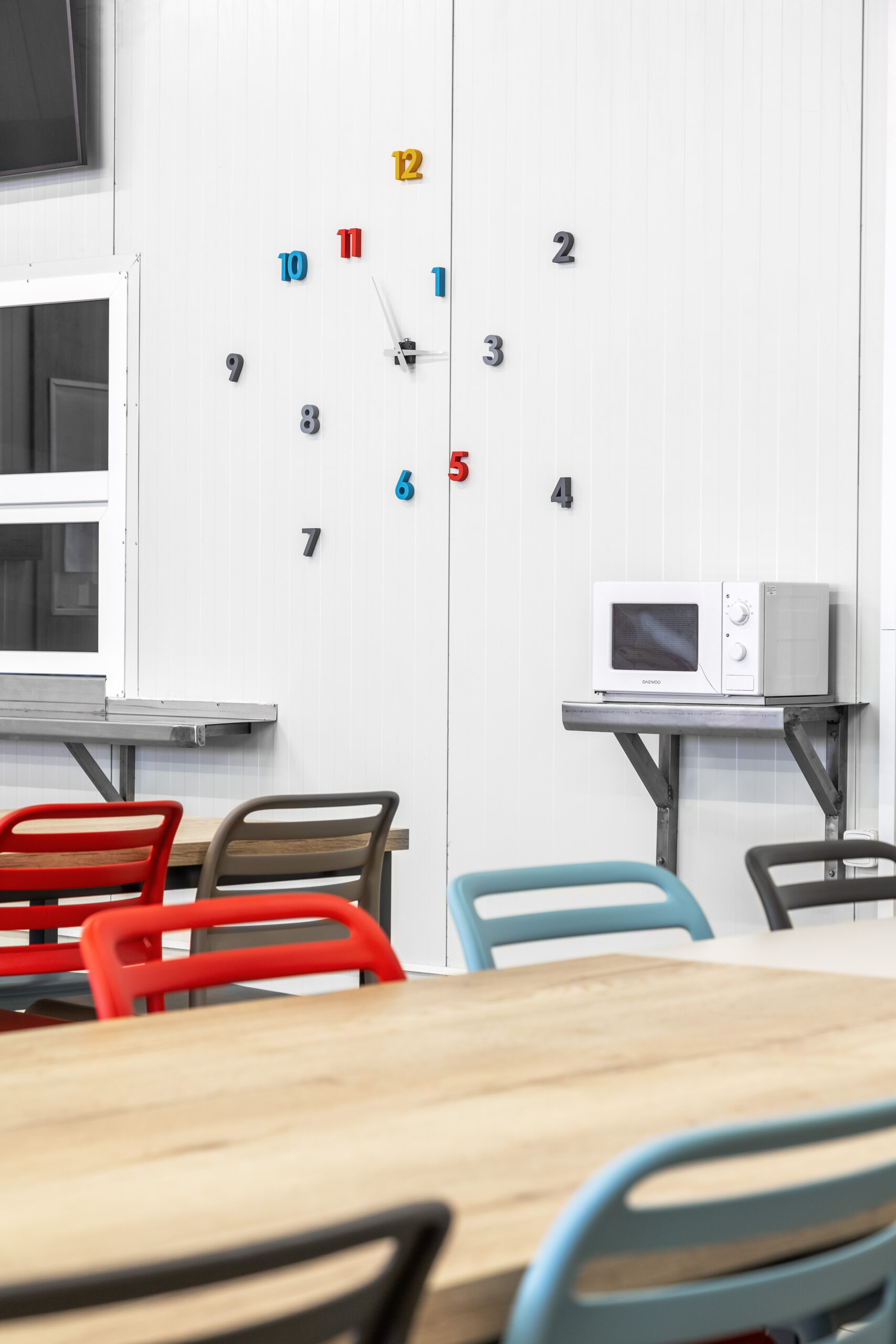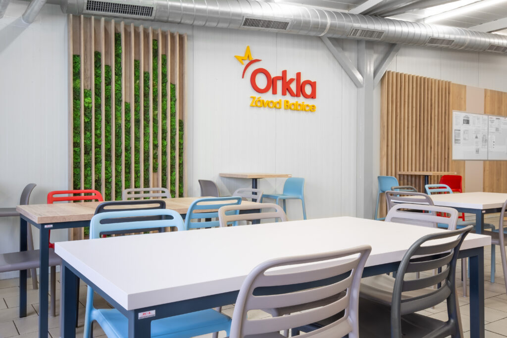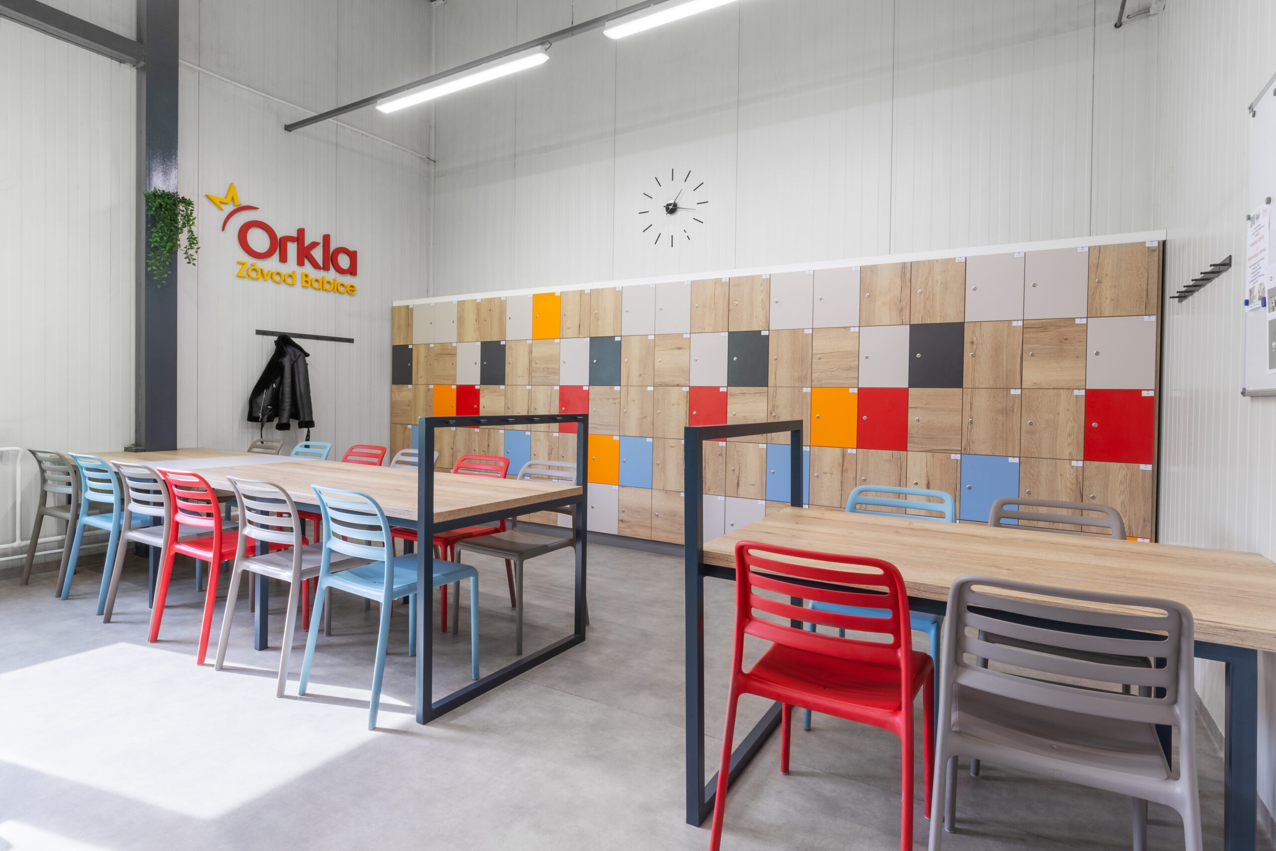 Návrh a realizace prostor pro zaměstnance. Velkokapacitní jídelna. Židličky musely být omyvatelné, proto jsem zvolila plastové v různých barvách. Na stěny jsem umístila laťky s mechem, či bez . Nechybí podniková nástěnka, či na míru, dle mého návrhu vyrobené věšáky v rámci podnože stolu, pro možnost odložení svršků. Zajímavé jsou i hodiny vytvořené na míru, ladící k barvám stoliček. Druhým prostorem byl návrh menší kuchyňky pro směnu na hale. Tam bylo zapotřebí udělat skříňky pro obě směny -100lidí! Aby si ji každý lépe poznal – volila jsem různé barvy. Všechny jsou uzamykatelné.