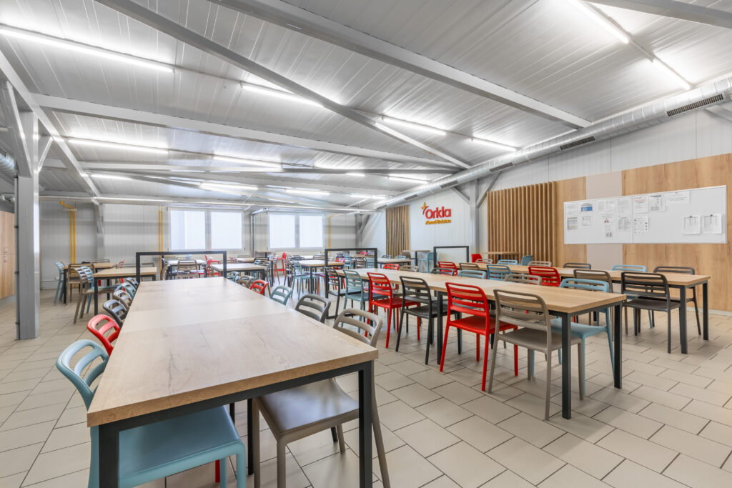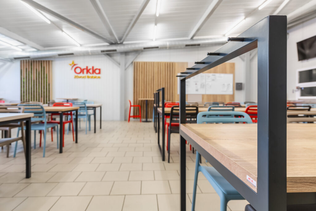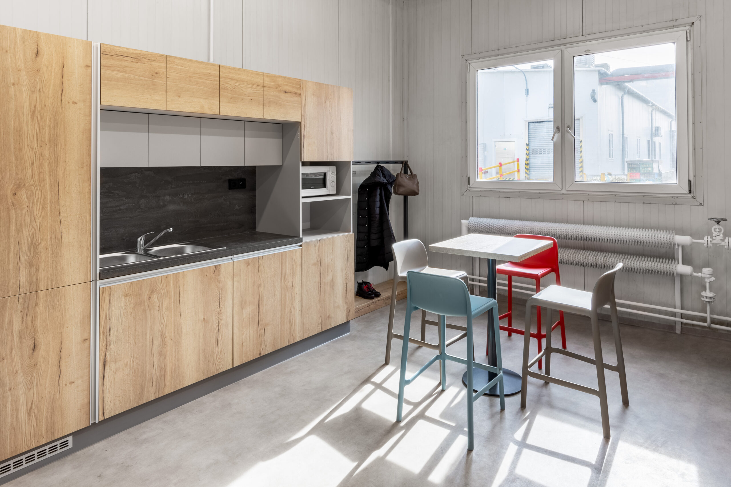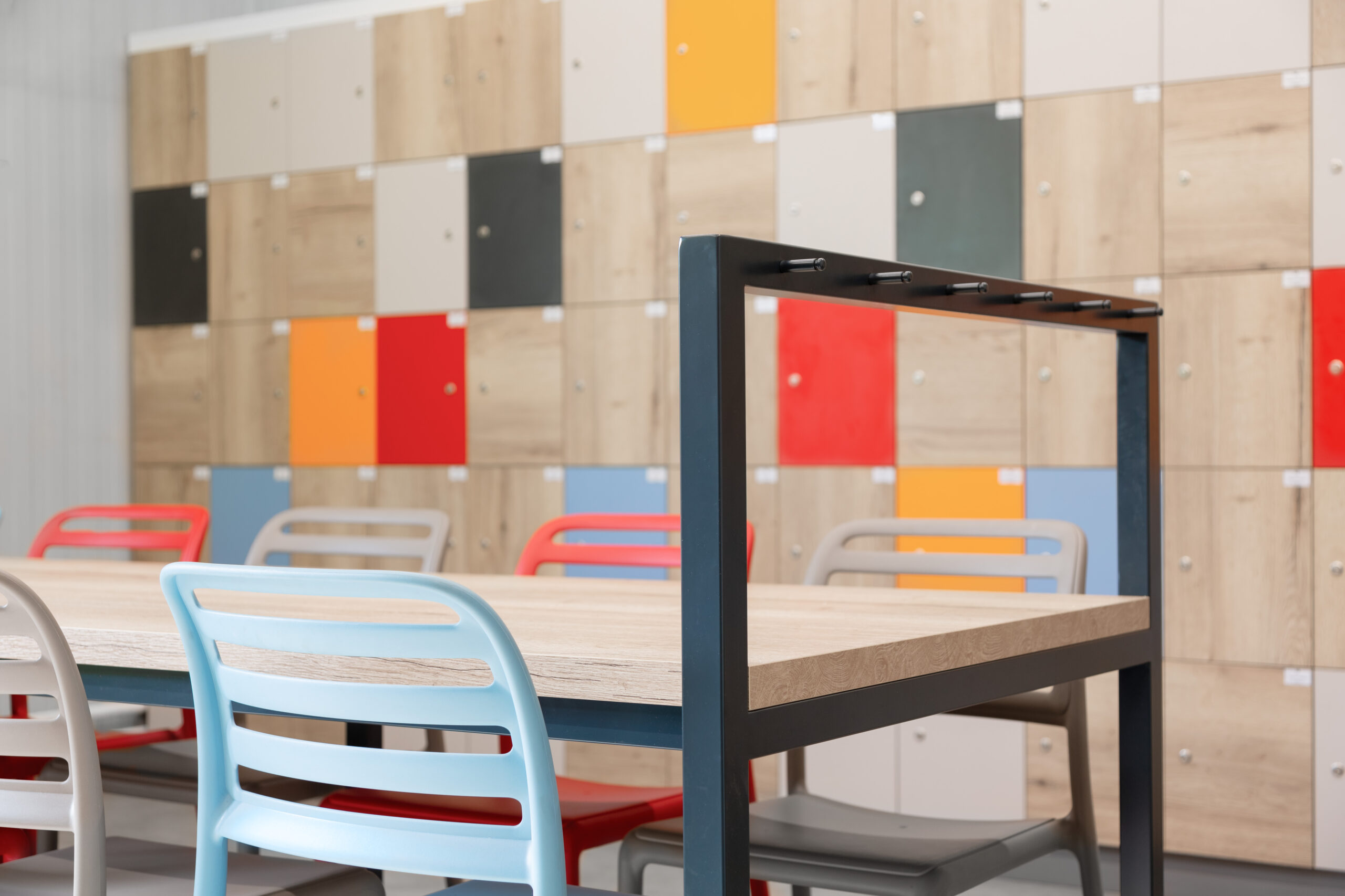 Návrh a realizace prostor pro zaměstnance. Velkokapacitní jídelna. Židličky musely být omyvatelné, proto jsem zvolila plastové v různých barvách. Na stěny jsem umístila laťky s mechem, či bez . Nechybí podniková nástěnka, či na míru, dle mého návrhu vyrobené věšáky v rámci podnože stolu, pro možnost odložení svršků. Zajímavé jsou i hodiny vytvořené na míru, ladící k barvám stoliček. Druhým prostorem byl návrh menší kuchyňky pro směnu na hale. Tam bylo zapotřebí udělat skříňky pro obě směny -100lidí! Aby si ji každý lépe poznal – volila jsem různé barvy. Všechny jsou uzamykatelné.
