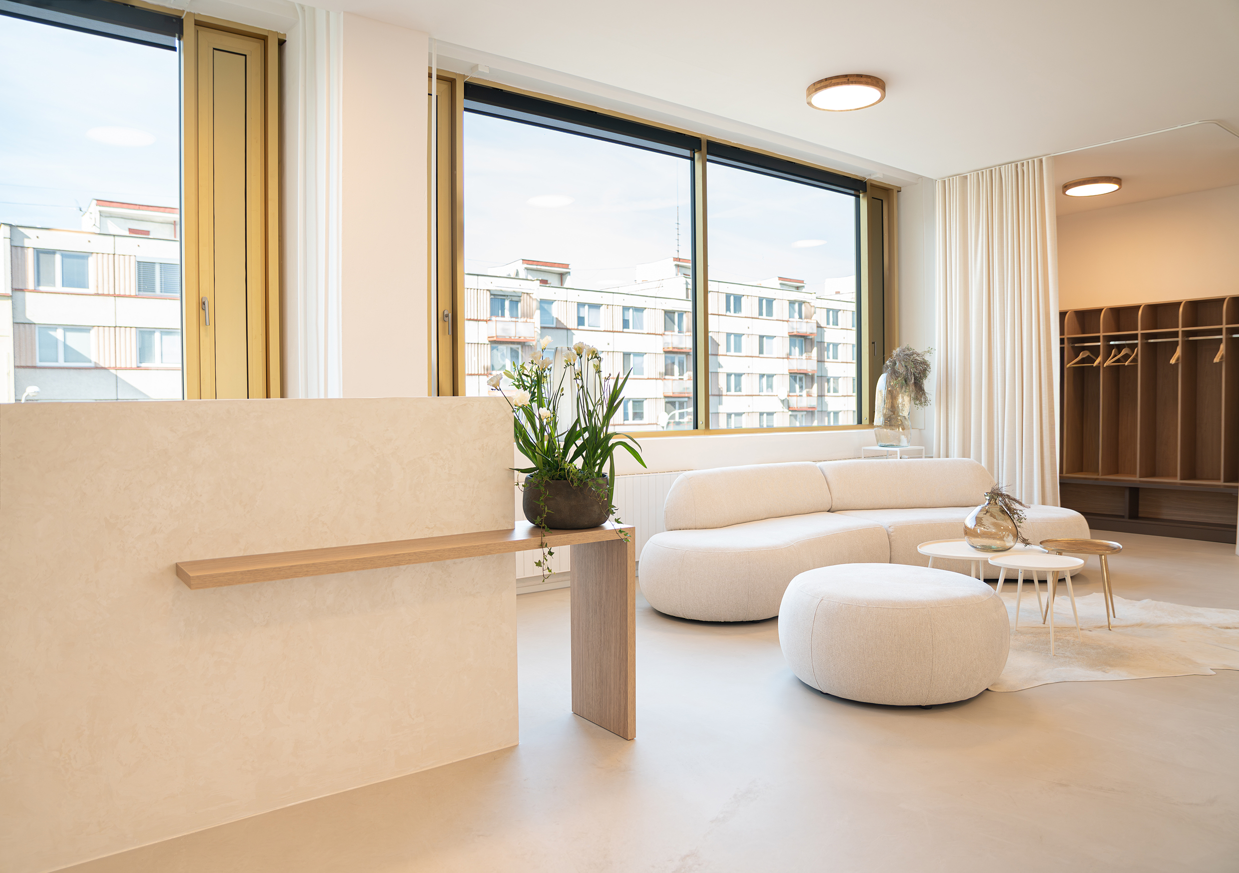 Zadáním investorky bylo vytvořit příjemně laděný, neutrální interiér, kde se budou lidé cítit uvolněně, klidně a kde pro ně bude samotný pobyt součástí zážitku, nikoli pouze výkonem spojeným s cvičením.
