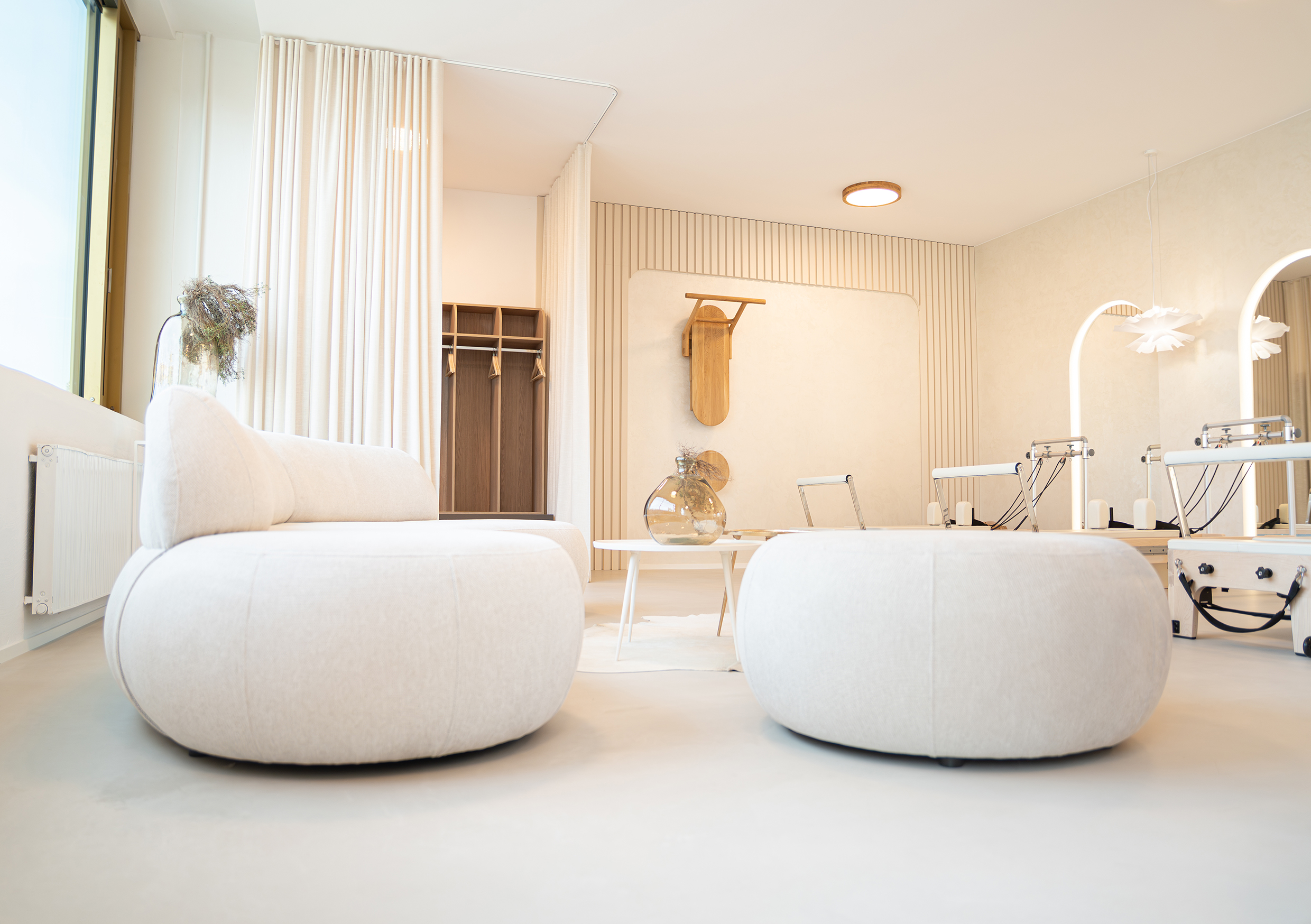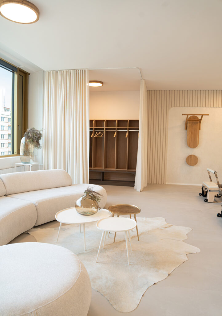 Celková plocha interiéru činí 75 m² a prostor je jasně a funkčně zónován na cvičící část, převlékací zónu, odpočinkový kout a recepci. Barevnost interiéru je postavena na jemných béžových a neutrálních tónech, které podporují pocit klidu a harmonie a nechávají vyniknout materiálům i světlu. Dominantním prvkem celého prostoru je stěrka od italské značky San Marco, která je použita jak na stěnách, tak i na recepčním pultu. Přestože je stěrka laděna do béžových odstínů, její jemné odlesky v kombinaci s denním světlem vytvářejí bohatou atmosféru hry světla a stínu, která se promítá do celého interiéru. Prostorem se prolínají organické tvary na zrcadlech, světlech i sedacích prvcích, které citlivě vyvažují rovné linie cvičebních strojů a laťkových obkladů.