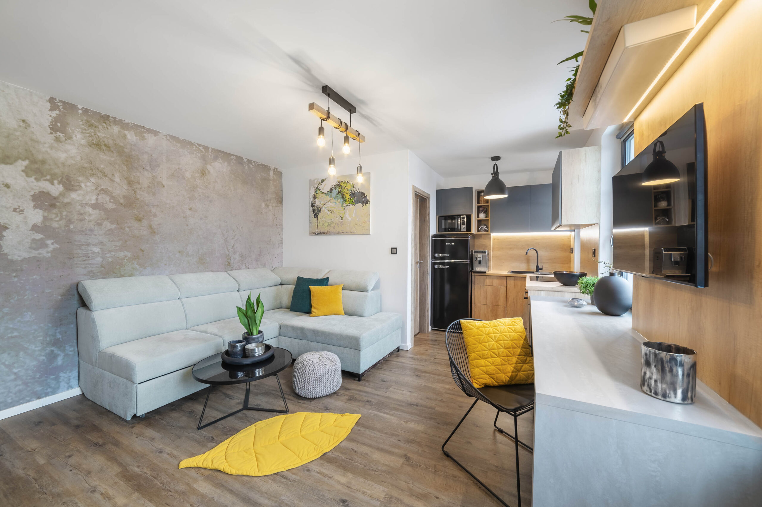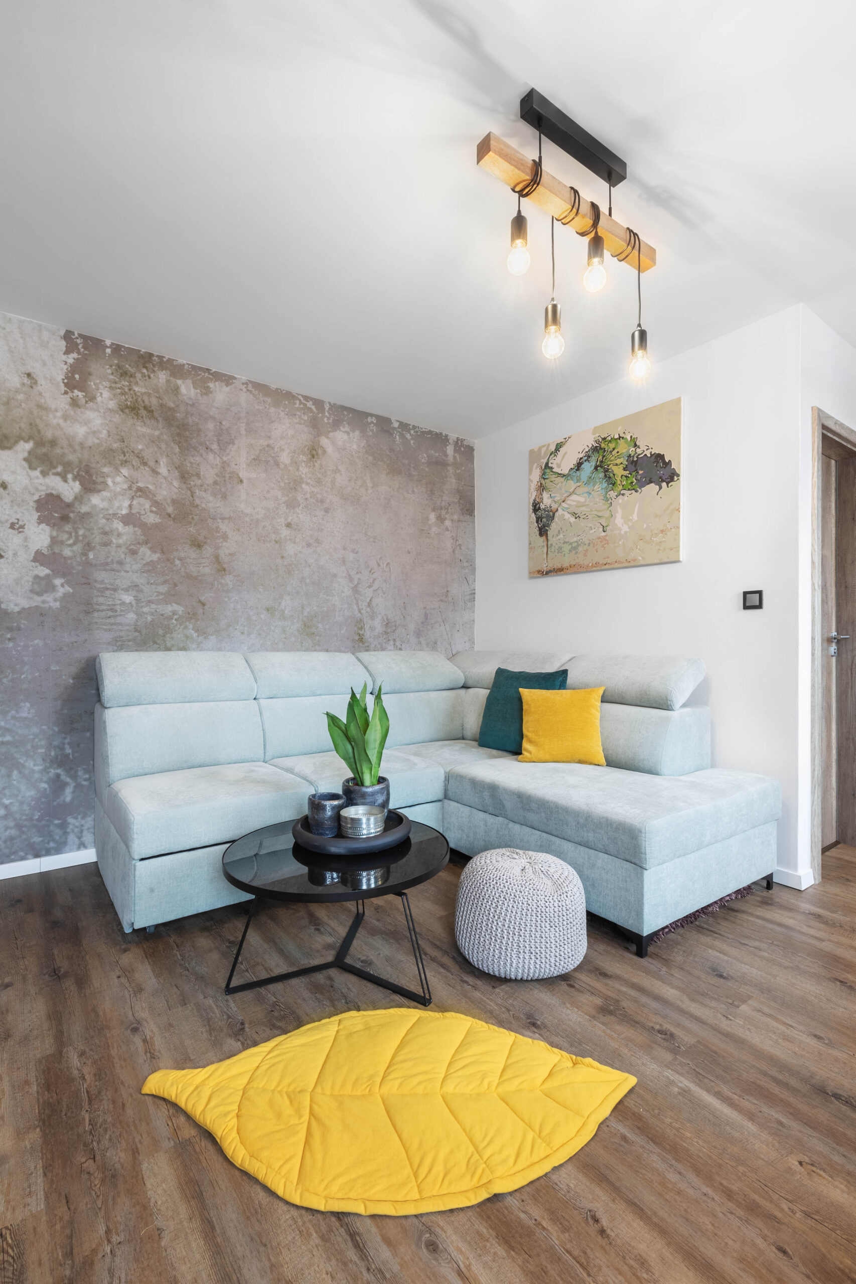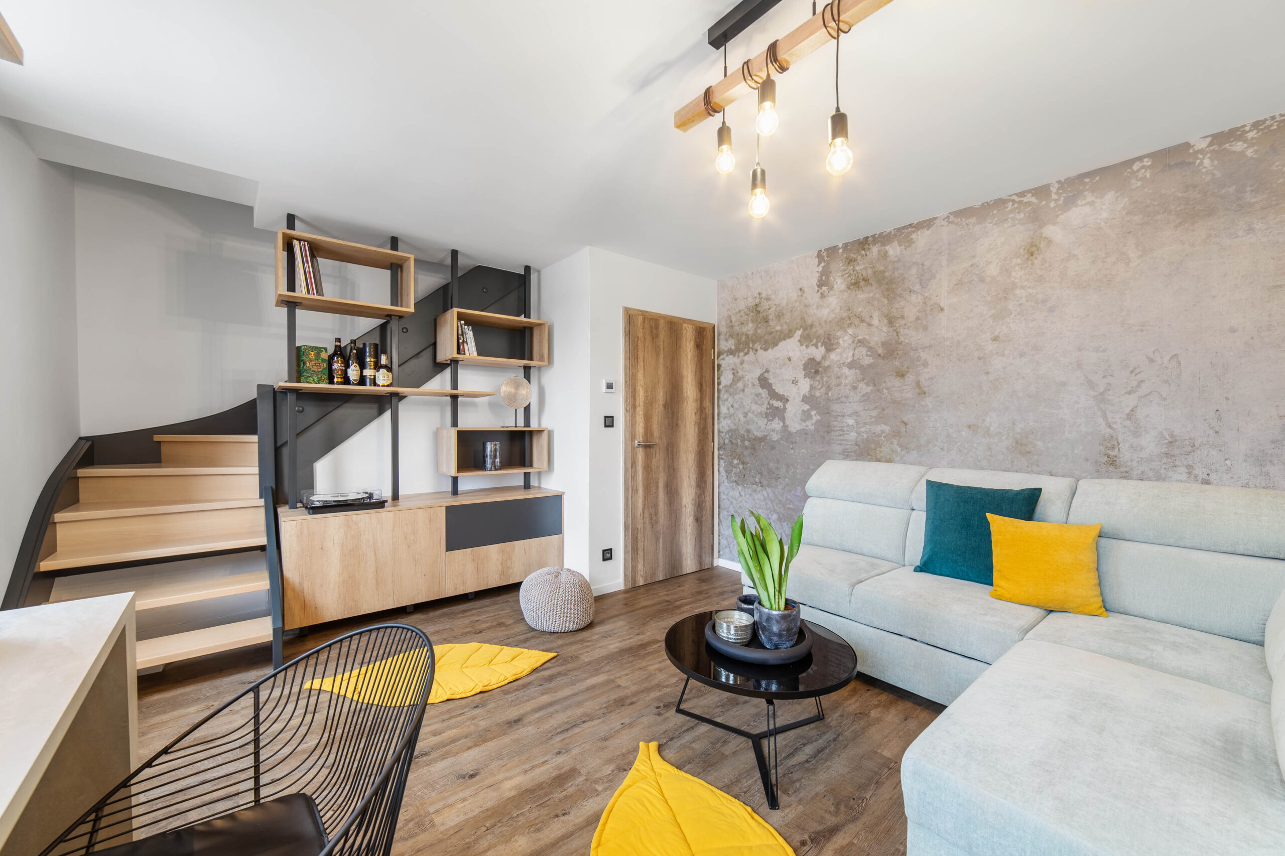 Návrh baťovského čtvrdomku ve Zlíně. Mladý pár mě oslovil na návrh a realizaci obývacího pokoje. Původní kuchyni jsme ještě doplnila o další úložné prostory a navrhla k ní stůl v betonovém designu. Stěnu za stolem jsem obložila dřevěnou deskou a na ni umístila TV a květináč. Zajímavým prvkem je designová tapeta. Barvu sedací soupravy jsme zvolily mátovou. Barevnost prostoru určil obraz, který malovala majitelka a hrdě visí nad sedačkou. Na míru jsem vytvořila komodu/knihovnu ke schodům, která je z kovu, a police vytváří zábradlí pro schodiště. Vše je doplněno černými detaily v konferenčním stolku, světlech či křesílku.