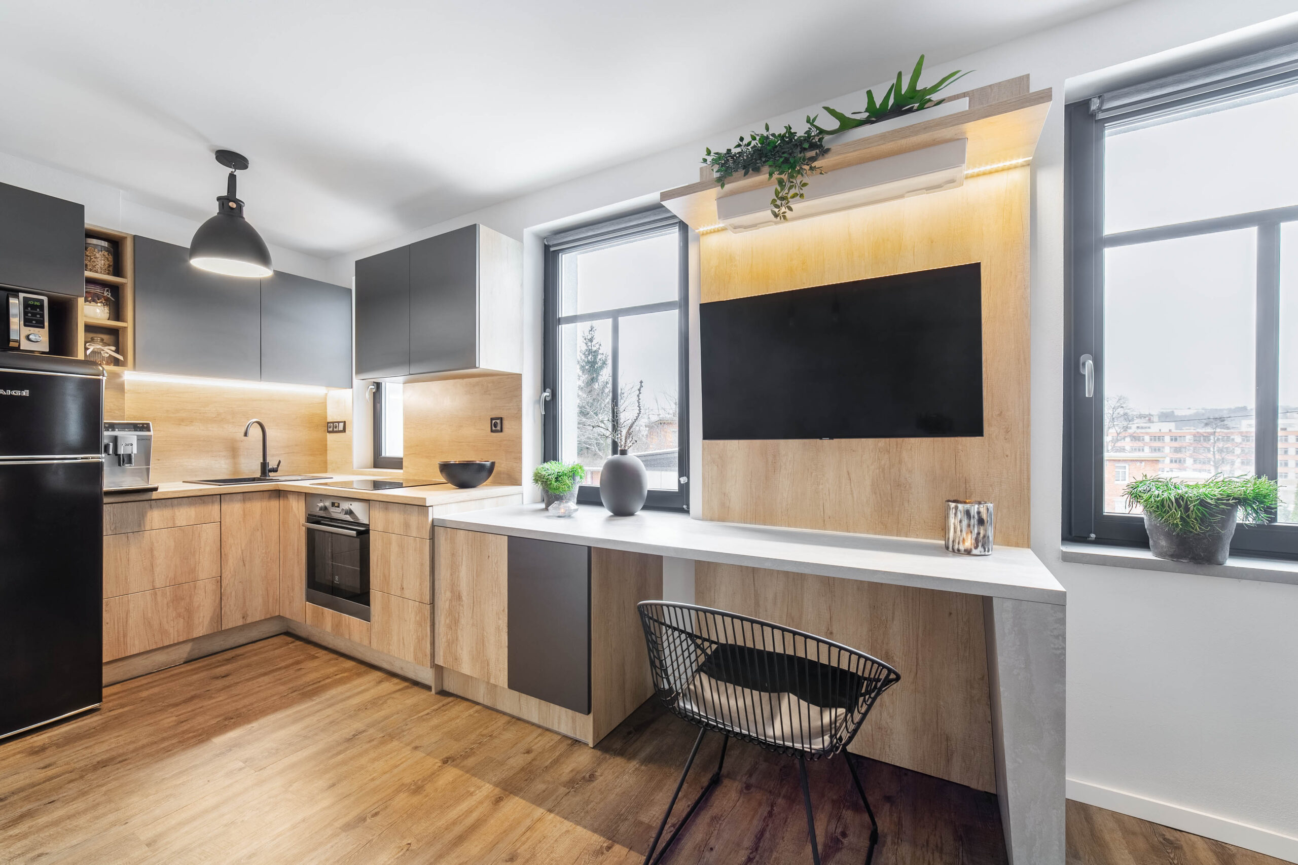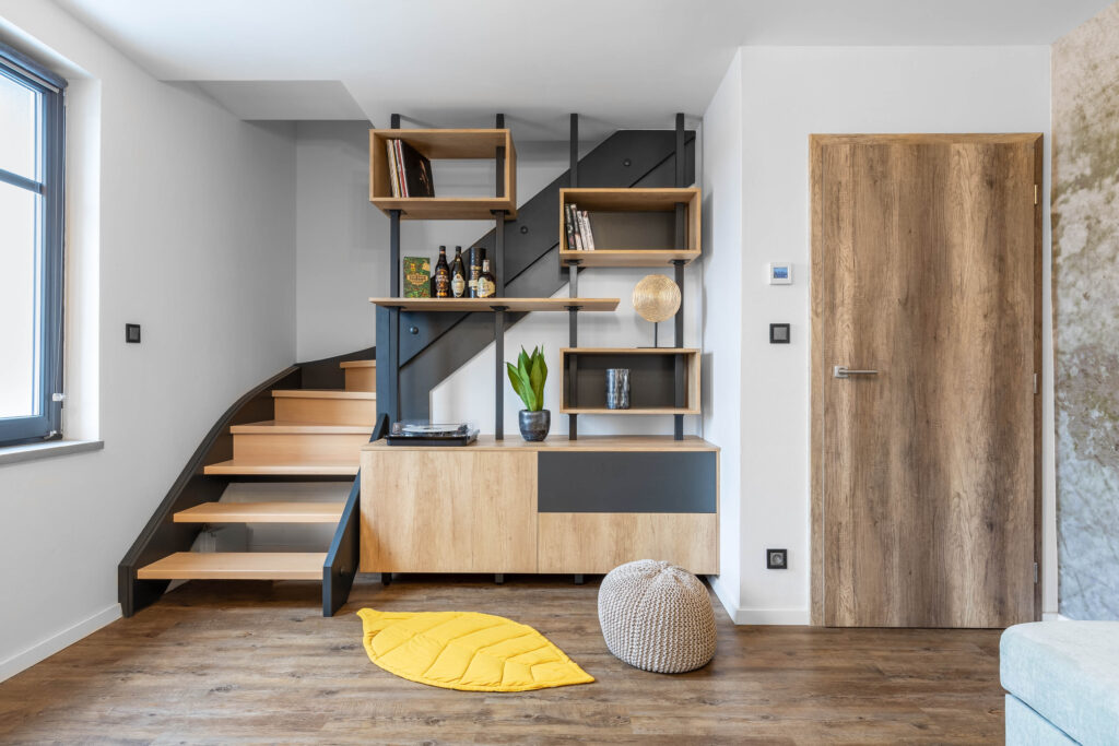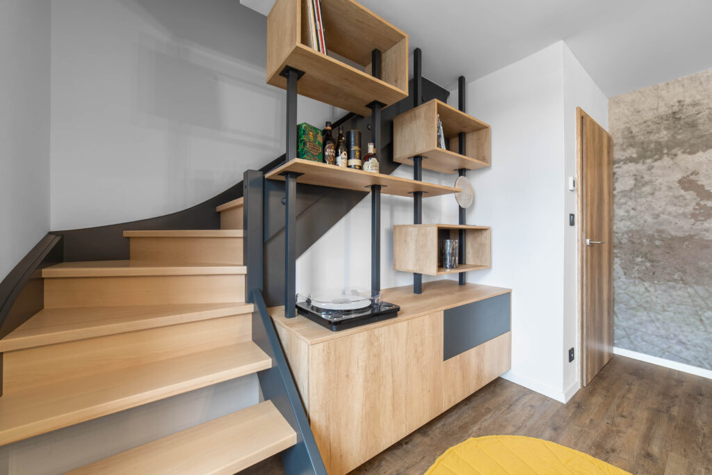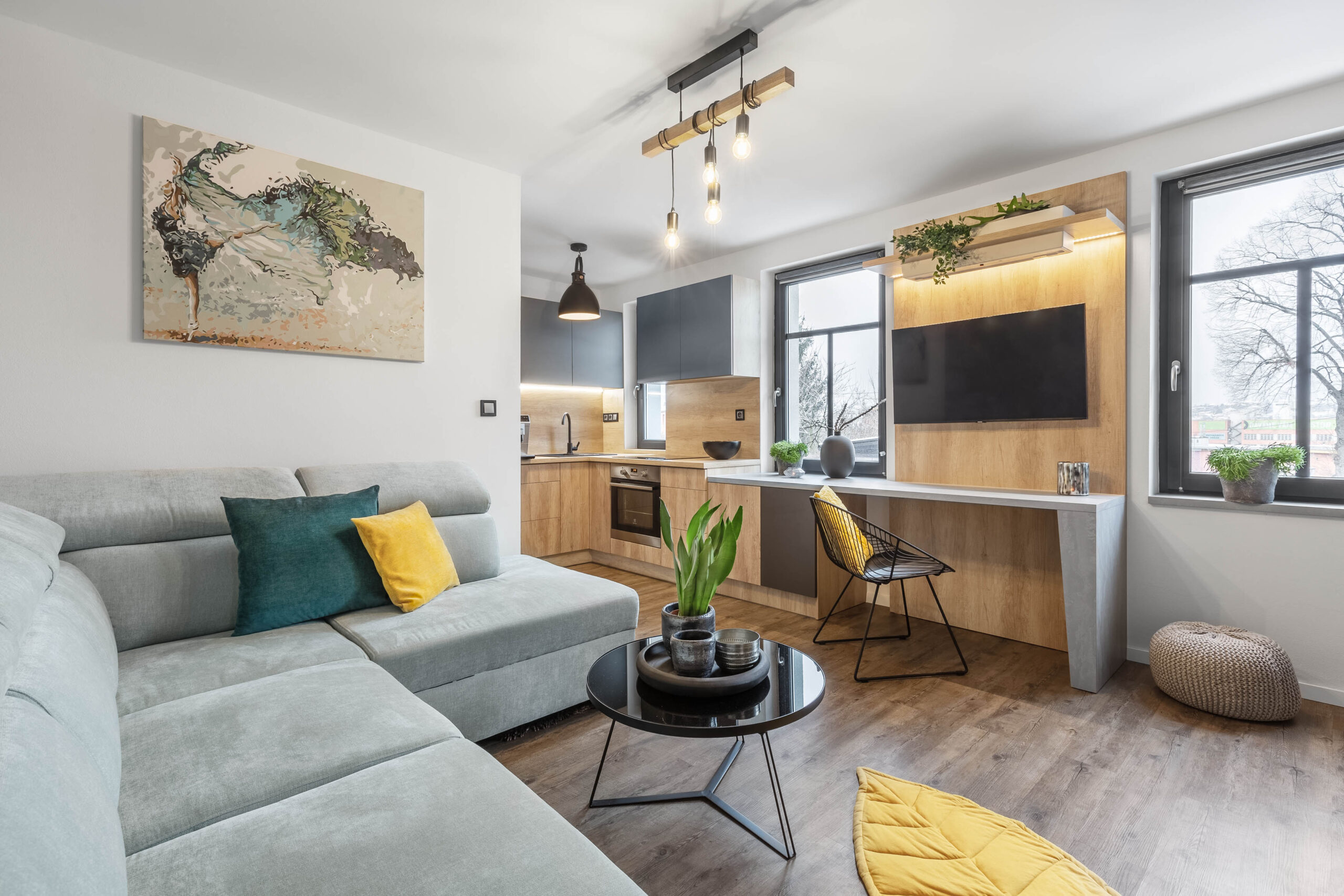 Návrh baťovského čtvrdomku ve Zlíně. Mladý pár mě oslovil na návrh a realizaci obývacího pokoje. Původní kuchyni jsme ještě doplnila o další úložné prostory a navrhla k ní stůl v betonovém designu. Stěnu za stolem jsem obložila dřevěnou deskou a na ni umístila TV a květináč. Zajímavým prvkem je designová tapeta. Barvu sedací soupravy jsme zvolily mátovou. Barevnost prostoru určil obraz, který malovala majitelka a hrdě visí nad sedačkou. Na míru jsem vytvořila komodu/knihovnu ke schodům, která je z kovu, a police vytváří zábradlí pro schodiště. Vše je doplněno černými detaily v konferenčním stolku, světlech či křesílku.