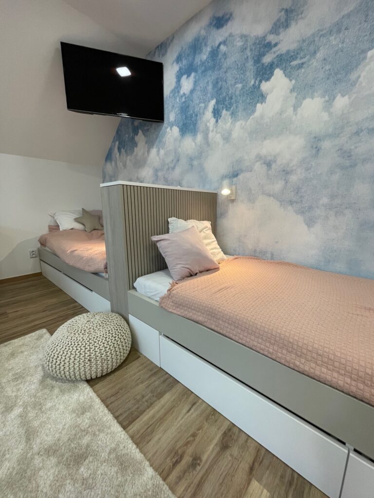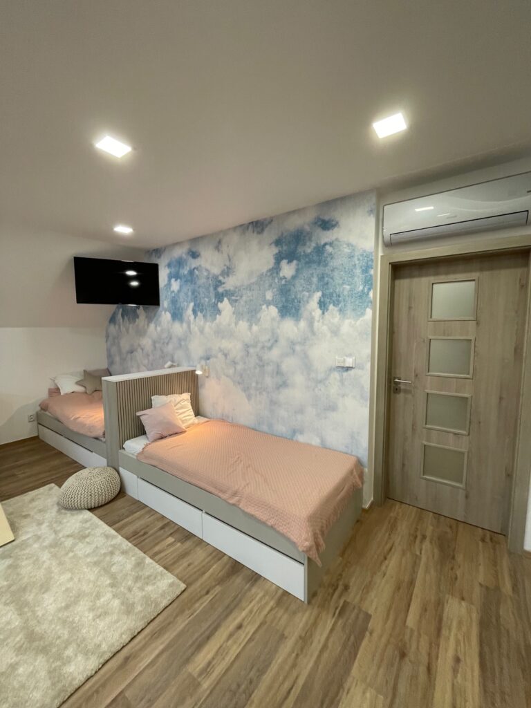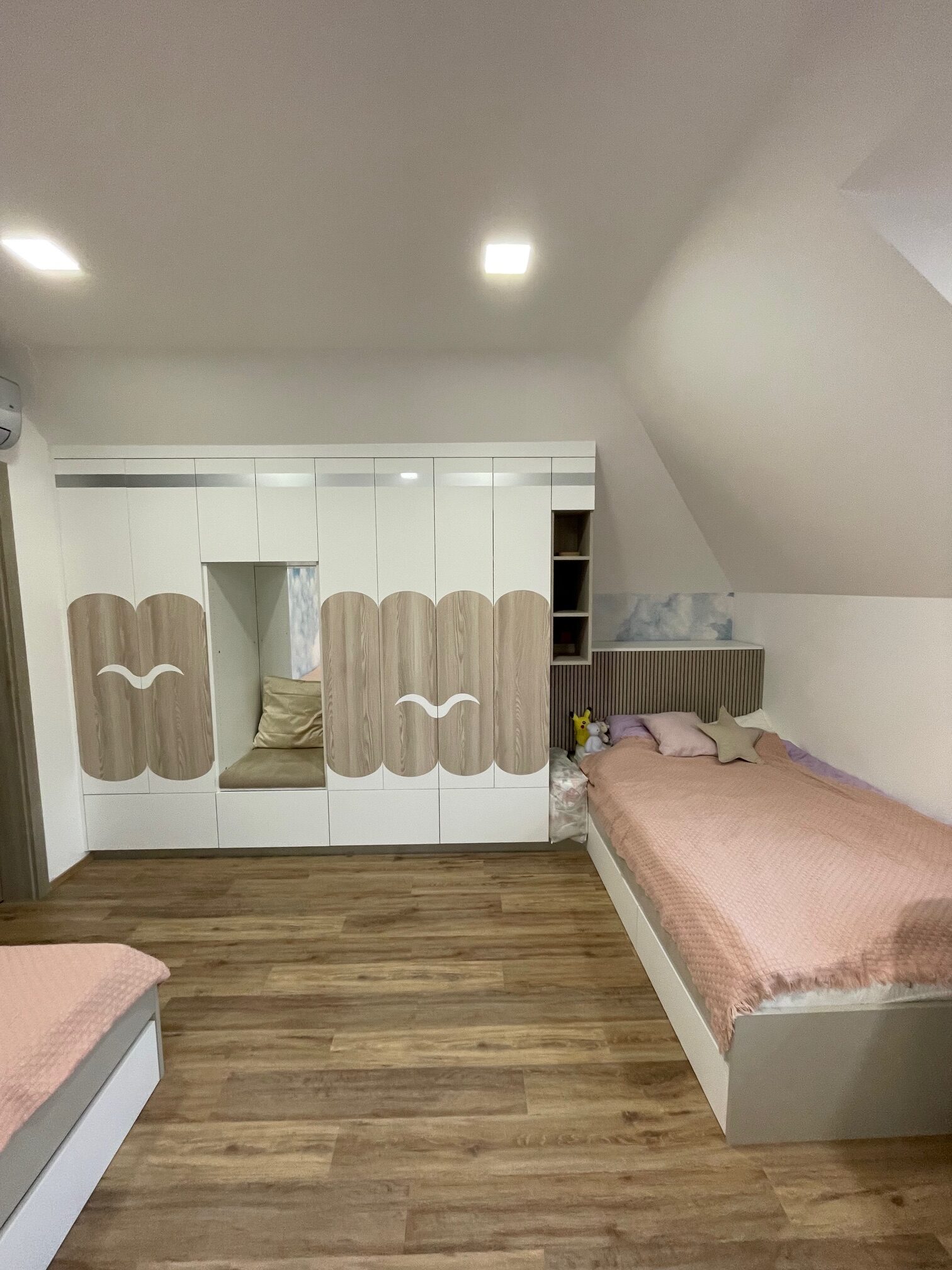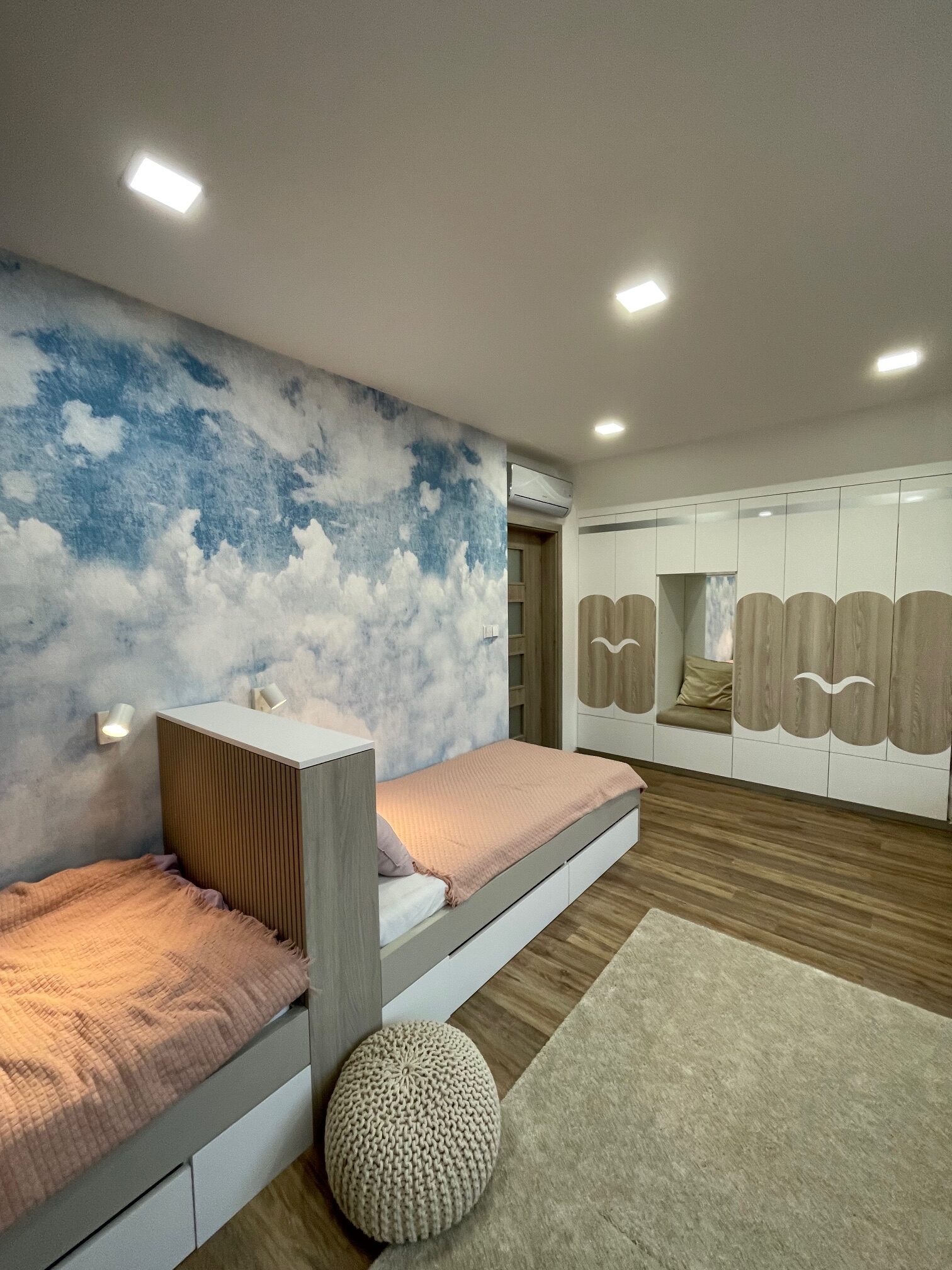 Za úkol jsem dostala vytvořit království pro tři slečny. Inspirací pro mě byli ptáčci na obloze. Siluetu ptáčků jsme frézovali do dveří skříně. Ta je ve střední části odlehčena sedací lavičkou a je nasvícena. Zboku je skříň využita i jako odkladná police k posteli. Pod oknem je situován velký stůl , který umožní dostatek místa k učení i tvoření. Tapetu jsem zvolila s motivem oblohy. Krásně doplní jemný interiér v barvách bílé, béžové a dřevodekoru. Neodpustila jsem si kapku pudrové v doplňcích.