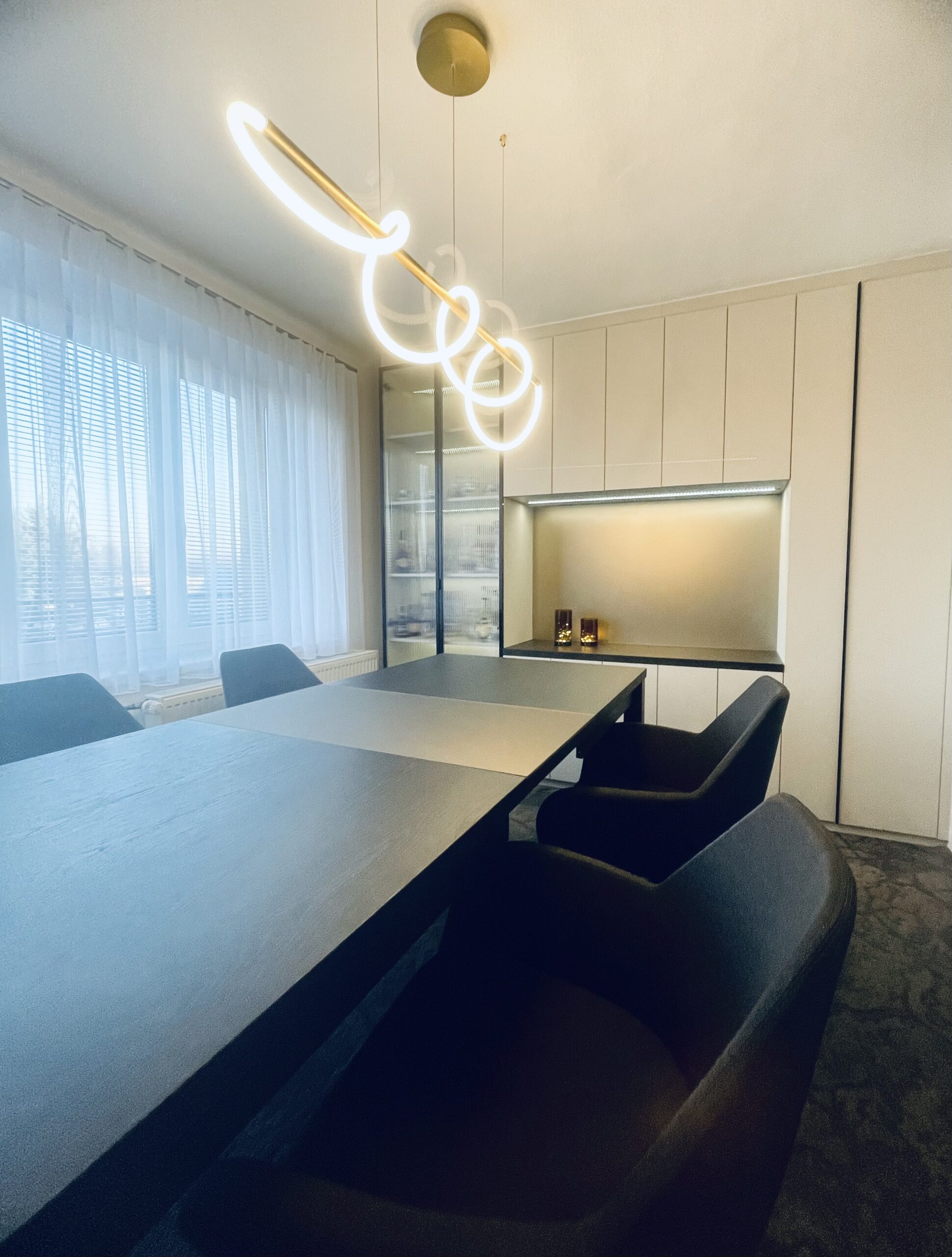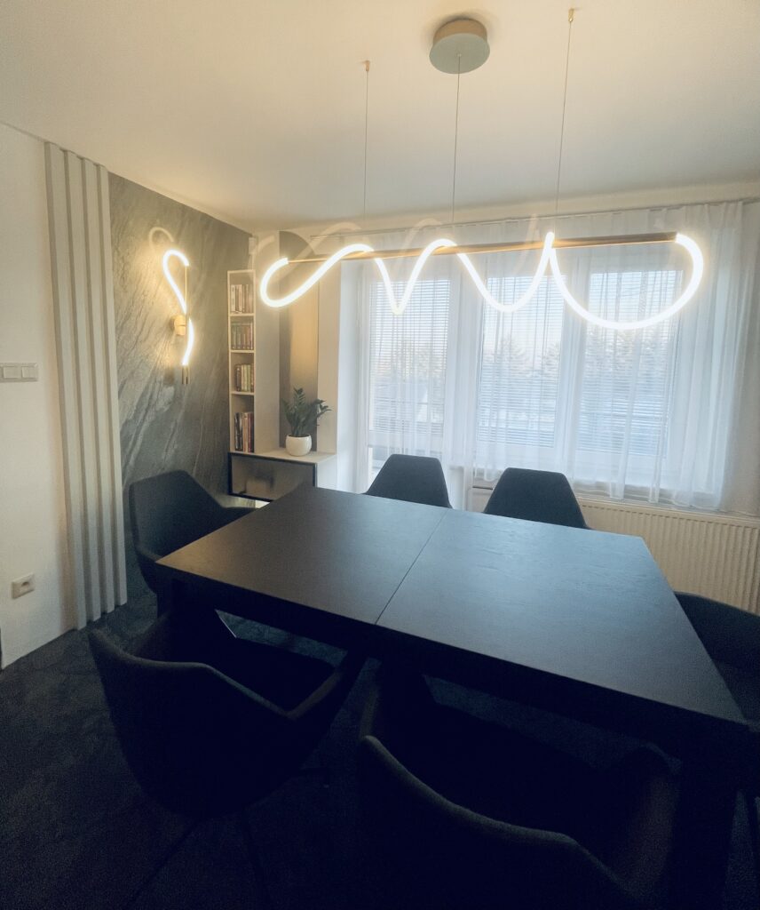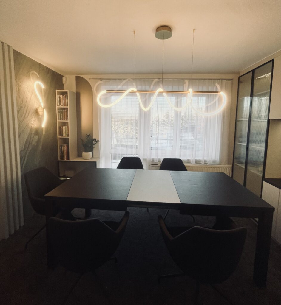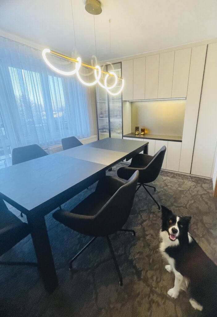 Návrh a následná realizace jídelny v Hulíně. Místnost byla malá, ale musel se do ní vlézt velký stůl a úložný prostor s barem. Ten je situován u okna s průhlednými dvířky. Sklo je „proužkováné“. Proužky se opakují v detailech i u kamenné dýhy. Barevnost jsem zvolila v neutrálních tónech béžové. Luxusním prvkem je zde kamenná dýha a metalické sklo v taupe odstínu, které je v úložném prostoru i jako rozkládací část stolu. S klienty jsme zvolili pohodlné křesílka, které jsou na otáčivé podnoži. Za povšimnutí stojí i osvětlení, které je zvoleno v moderním stylu. Hnědý koberec celý návrh doplňuje.