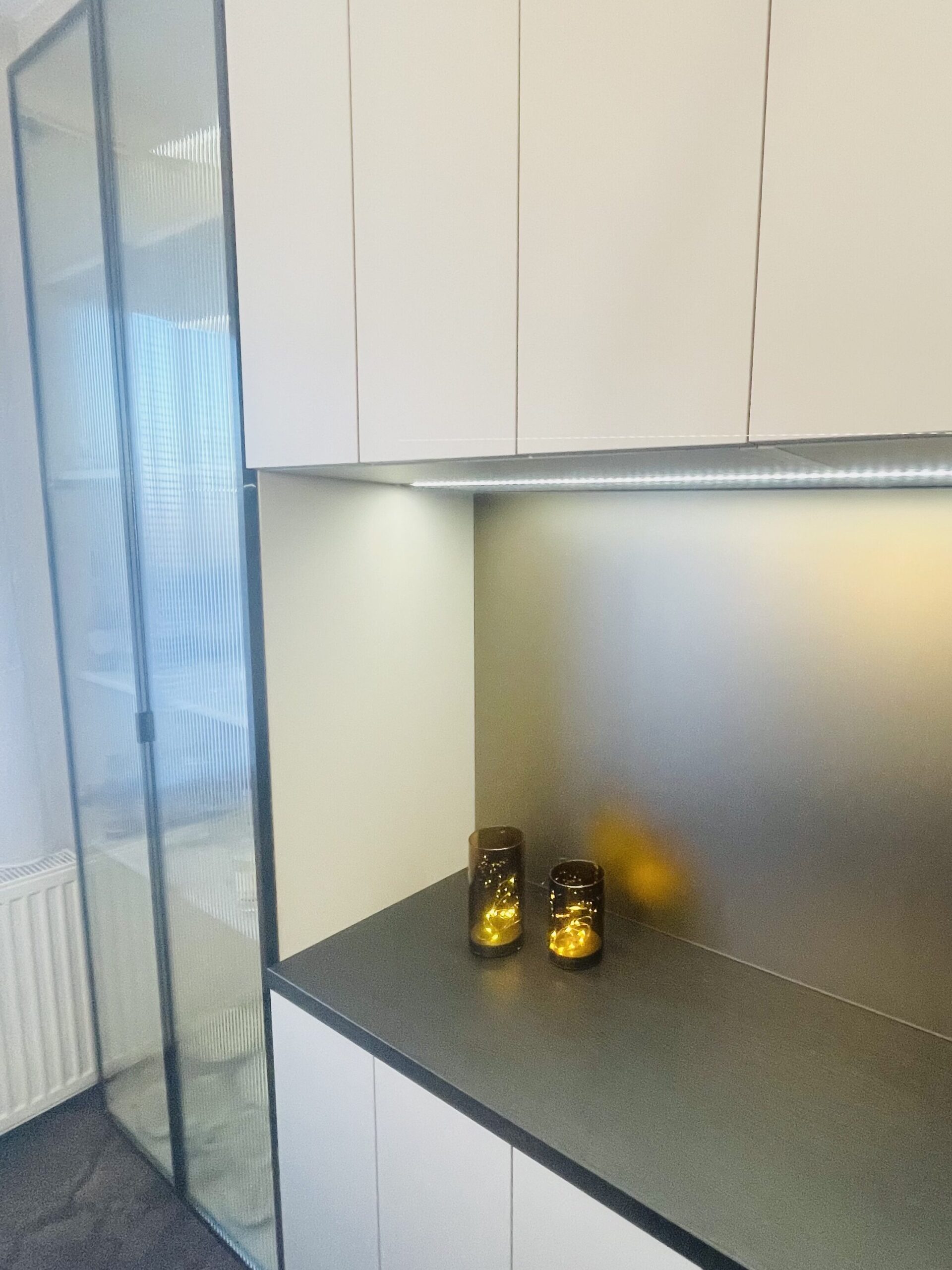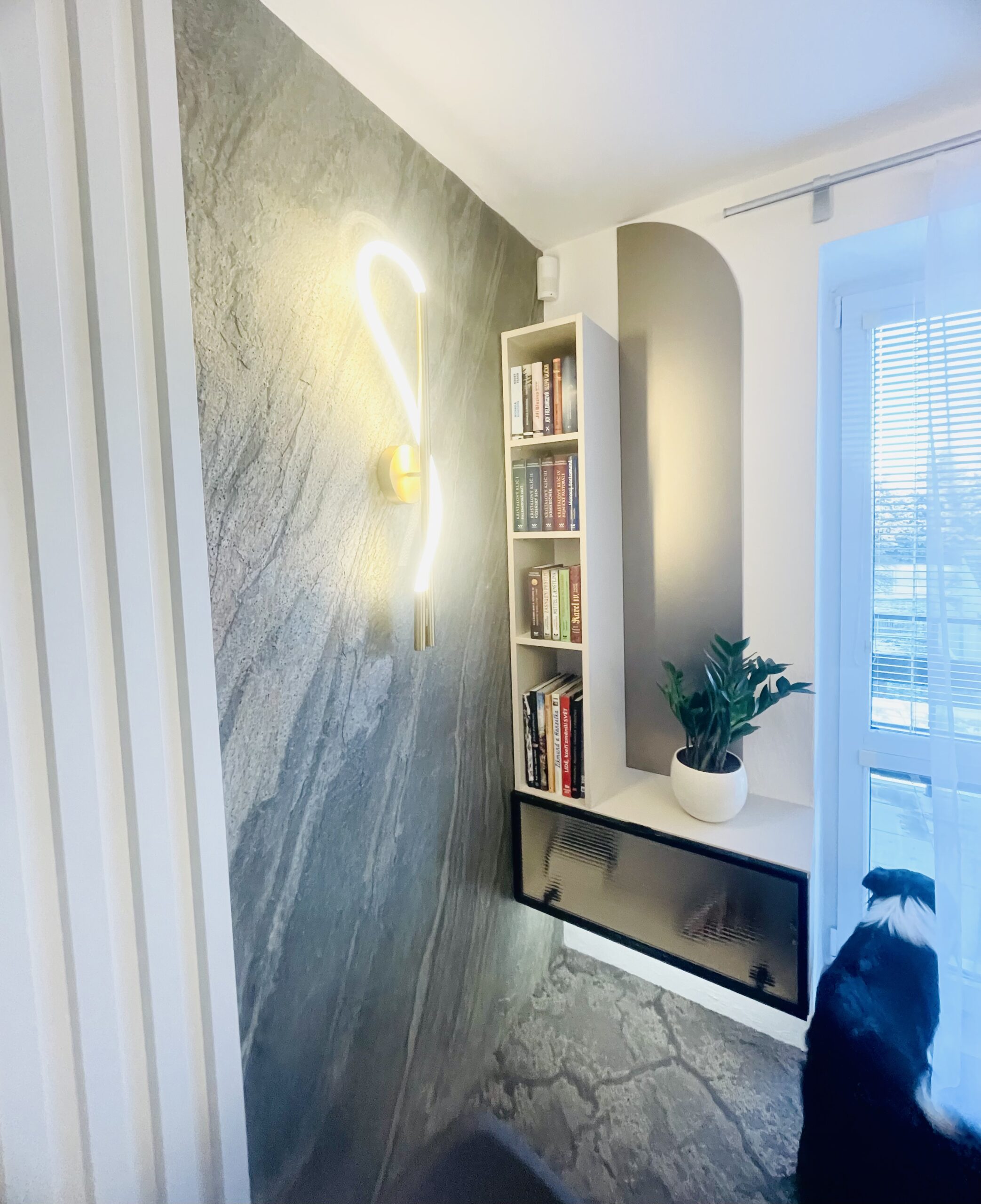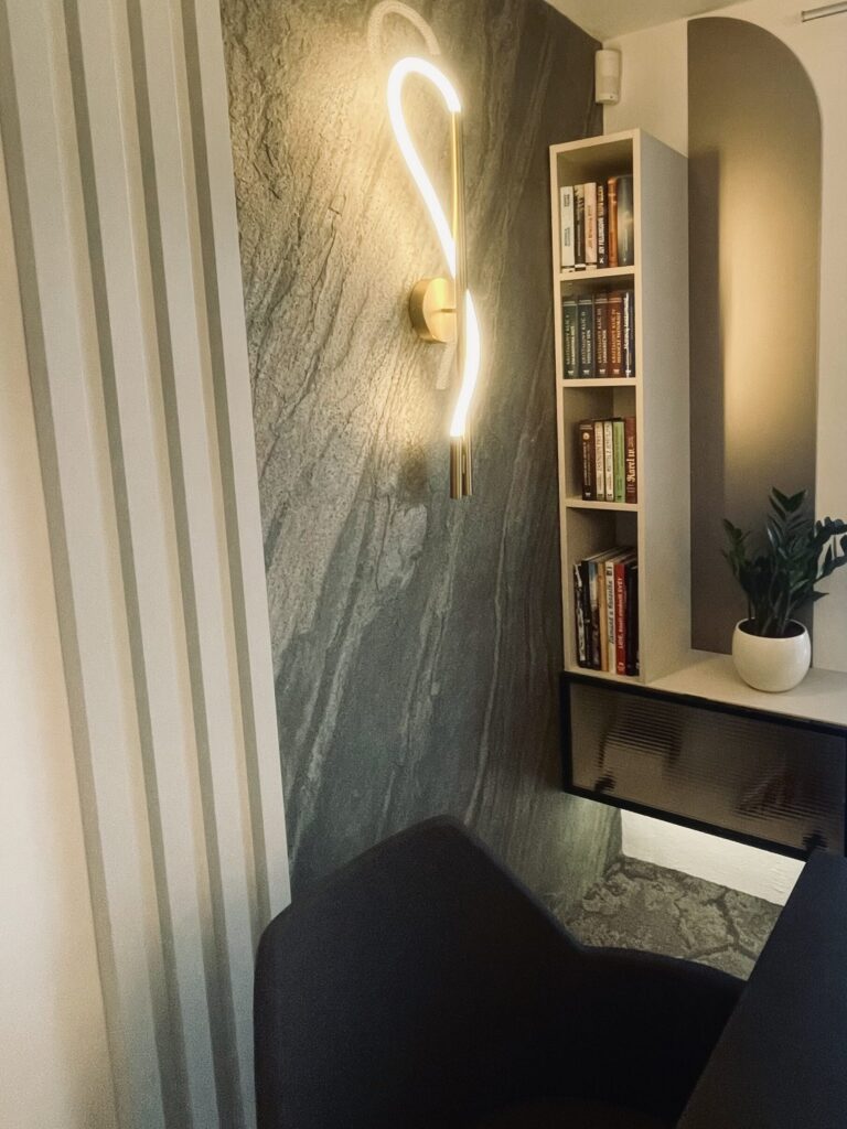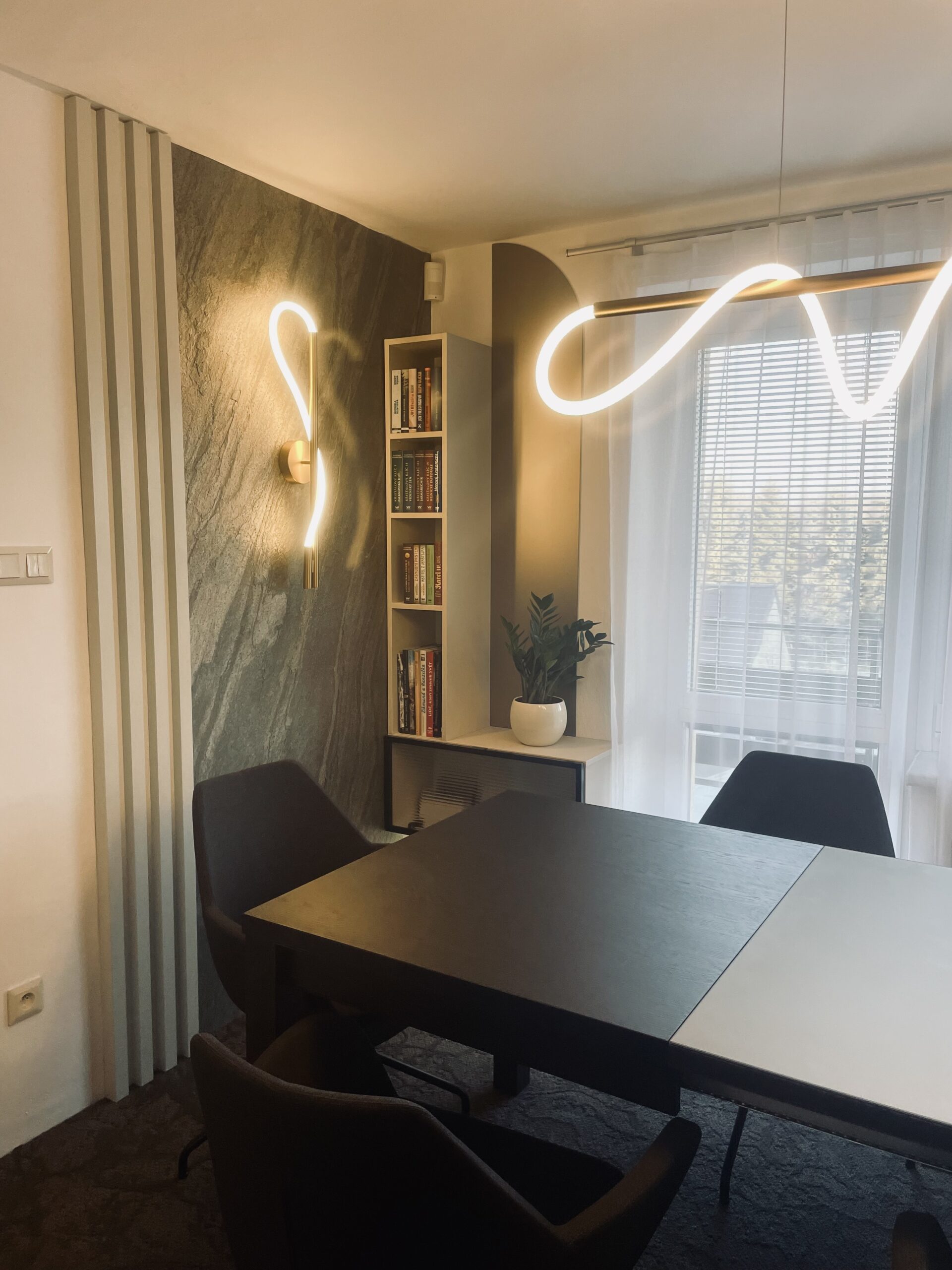 Návrh a následná realizace jídelny v Hulíně. Místnost byla malá, ale musel se do ní vlézt velký stůl a úložný prostor s barem. Ten je situován u okna s průhlednými dvířky. Sklo je „proužkováné“. Proužky se opakují v detailech i u kamenné dýhy. Barevnost jsem zvolila v neutrálních tónech béžové. Luxusním prvkem je zde kamenná dýha a metalické sklo v taupe odstínu, které je v úložném prostoru i jako rozkládací část stolu. S klienty jsme zvolili pohodlné křesílka, které jsou na otáčivé podnoži. Za povšimnutí stojí i osvětlení, které je zvoleno v moderním stylu. Hnědý koberec celý návrh doplňuje.