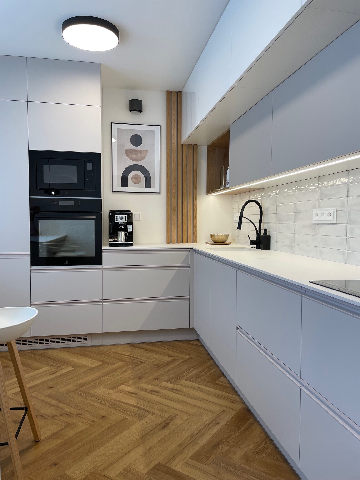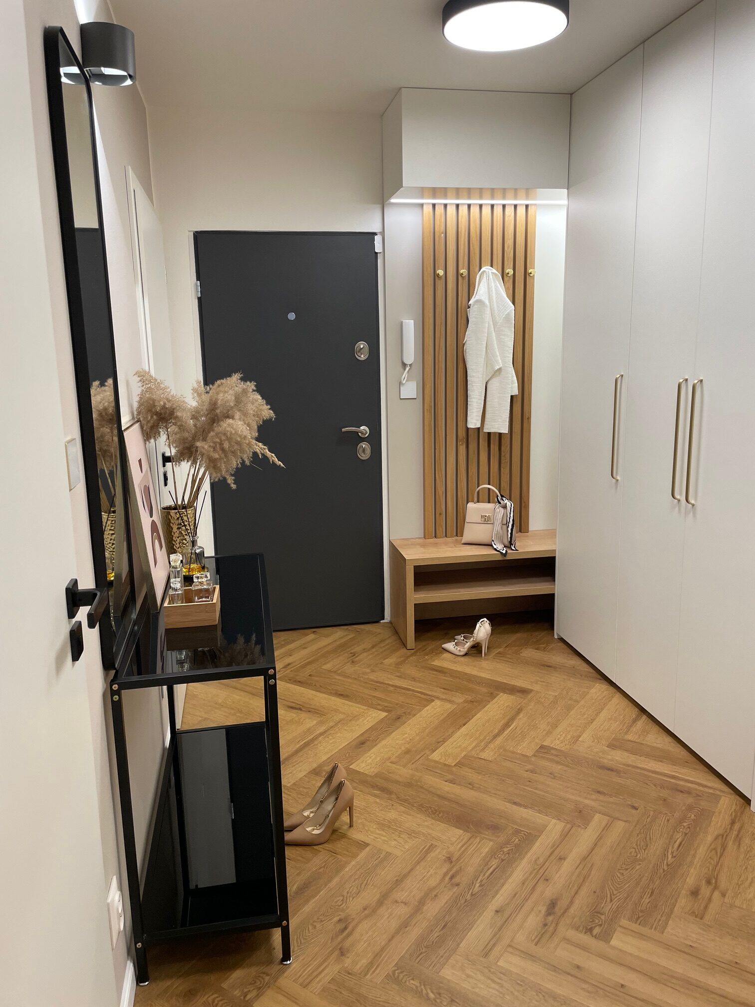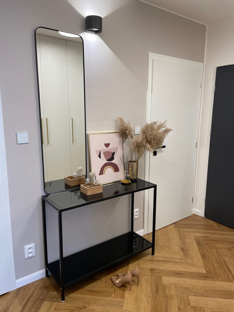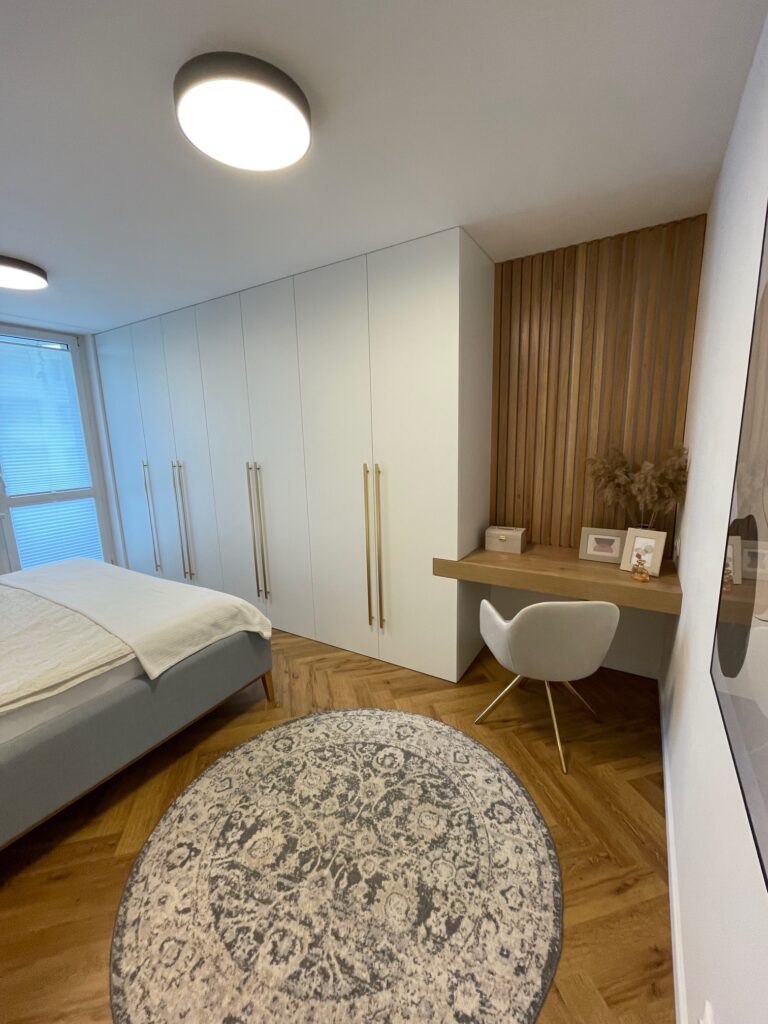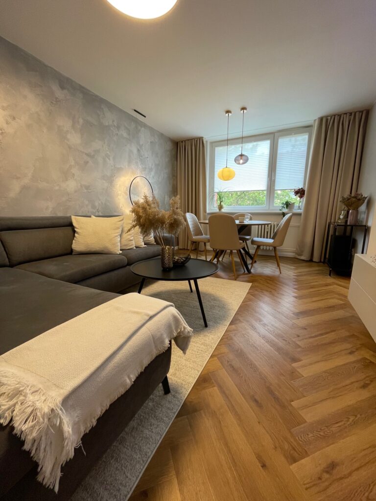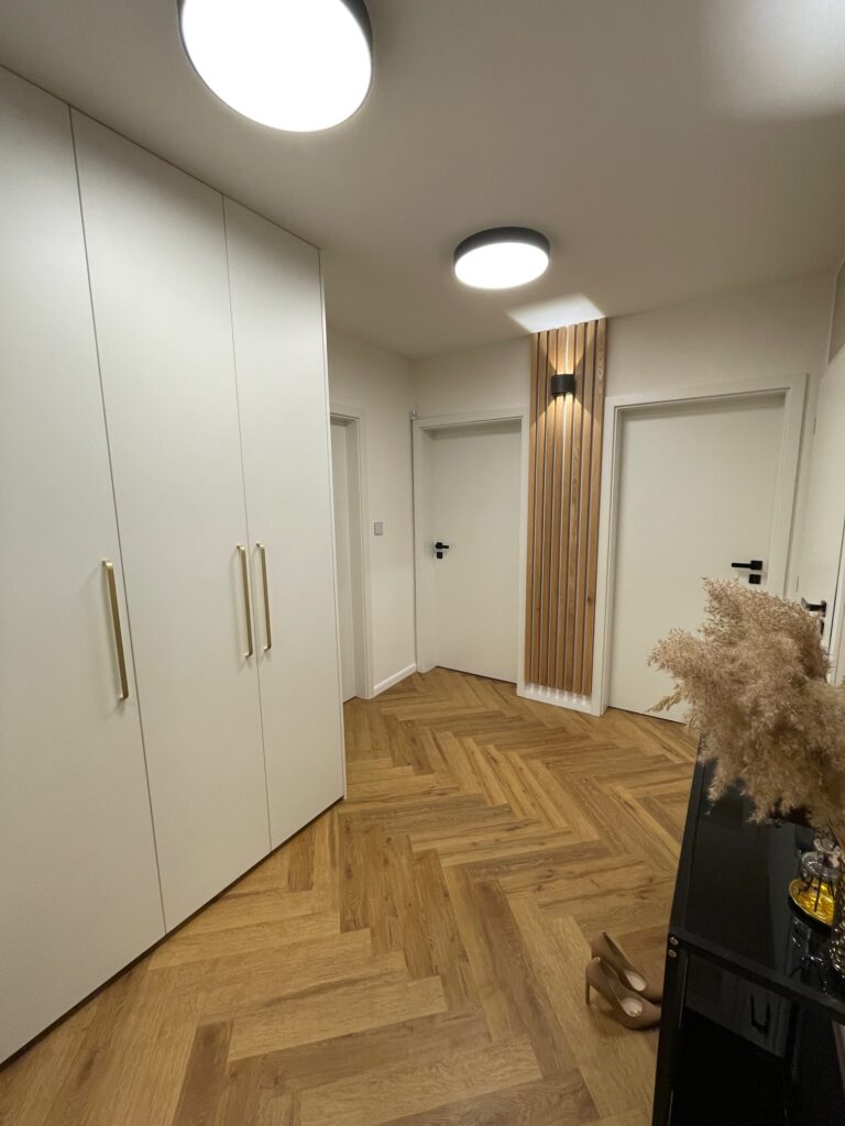 Tento starší byt rekonstruoval mladý pár. Navrhovala jsem kuchyni, obývací pokoj, koupelnu, toaletu, chodbu a ložnici. Speciálním přáním, zde byl návrh rumové skříňky. Dominantou v prostoru je podlaha s moderní „stromečkovou“ vazbou, která je v celém bytě, kromě koupelny a toalety. Celý byt je pojat ve světlých přírodních tónech s doplňky zlaté a černé. V obývacím pokoji je za sedací soupravou natáhnuta stěrka v šedém tónu. V koupelně je ještě zopakován vzor stromečku ve skladbě obkladu za vanou. Obdelníkové obklady jsou pak použity i za pracovní deskou v kuchyni. Ta je volena z kompaktu a umožnila použití praktického podstavného dřezu.