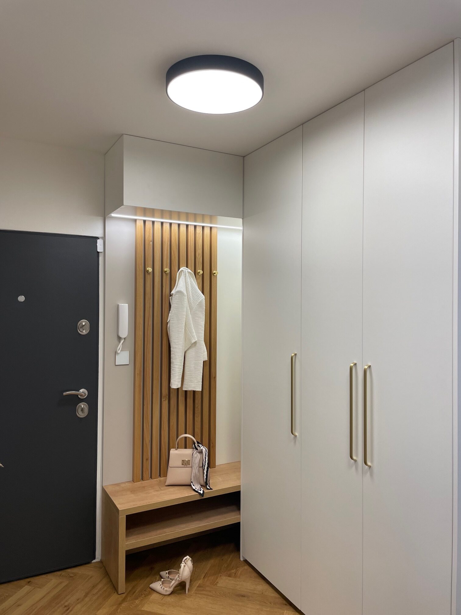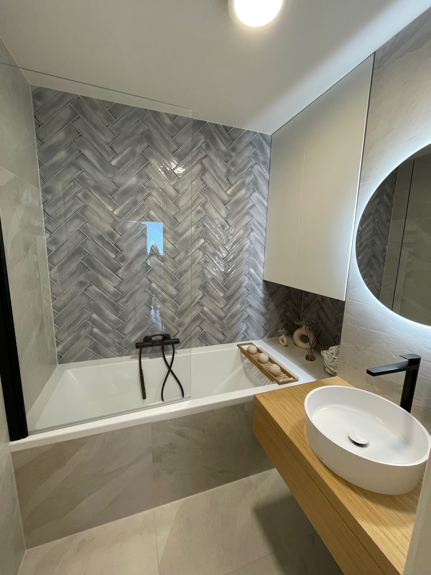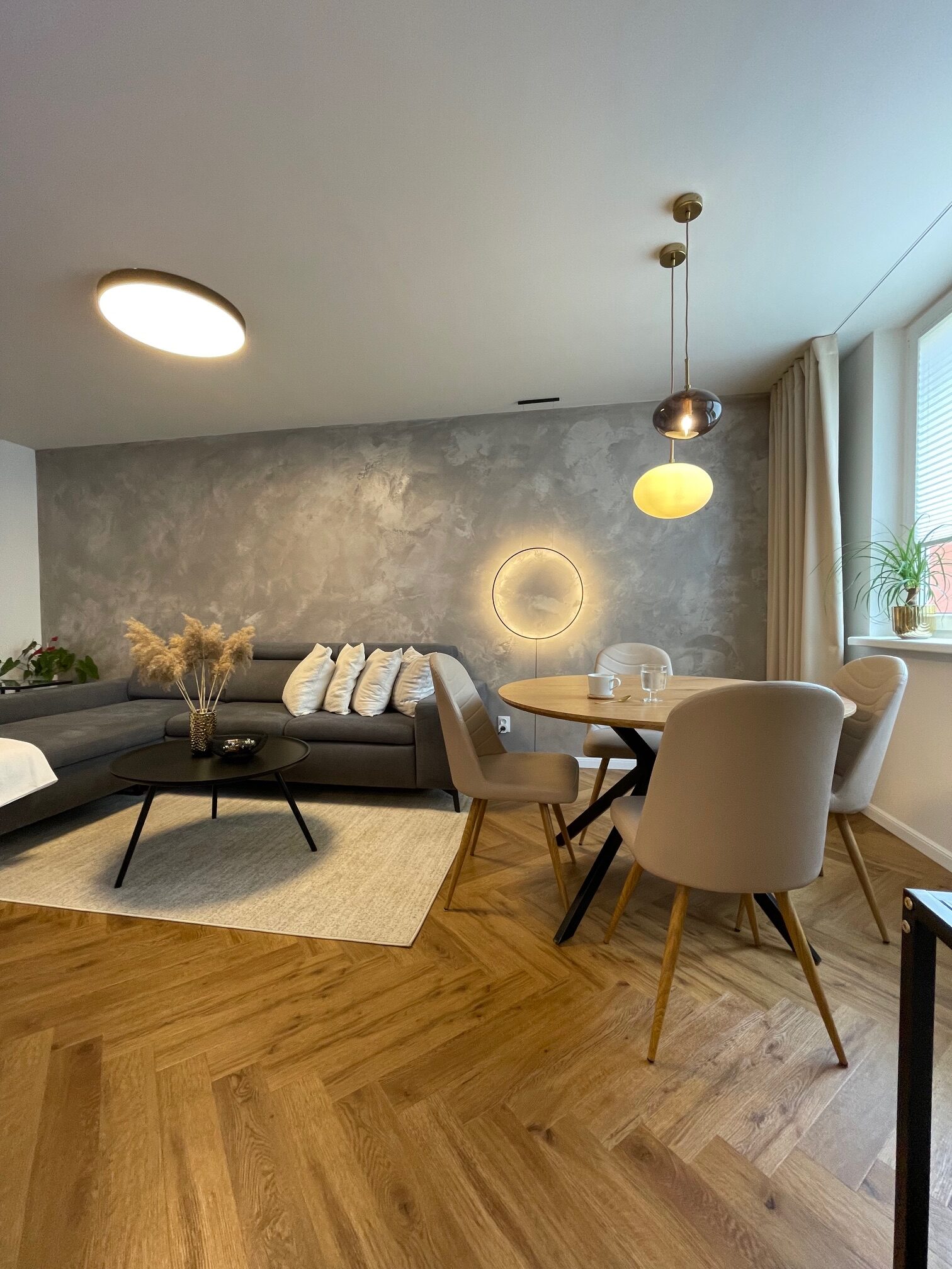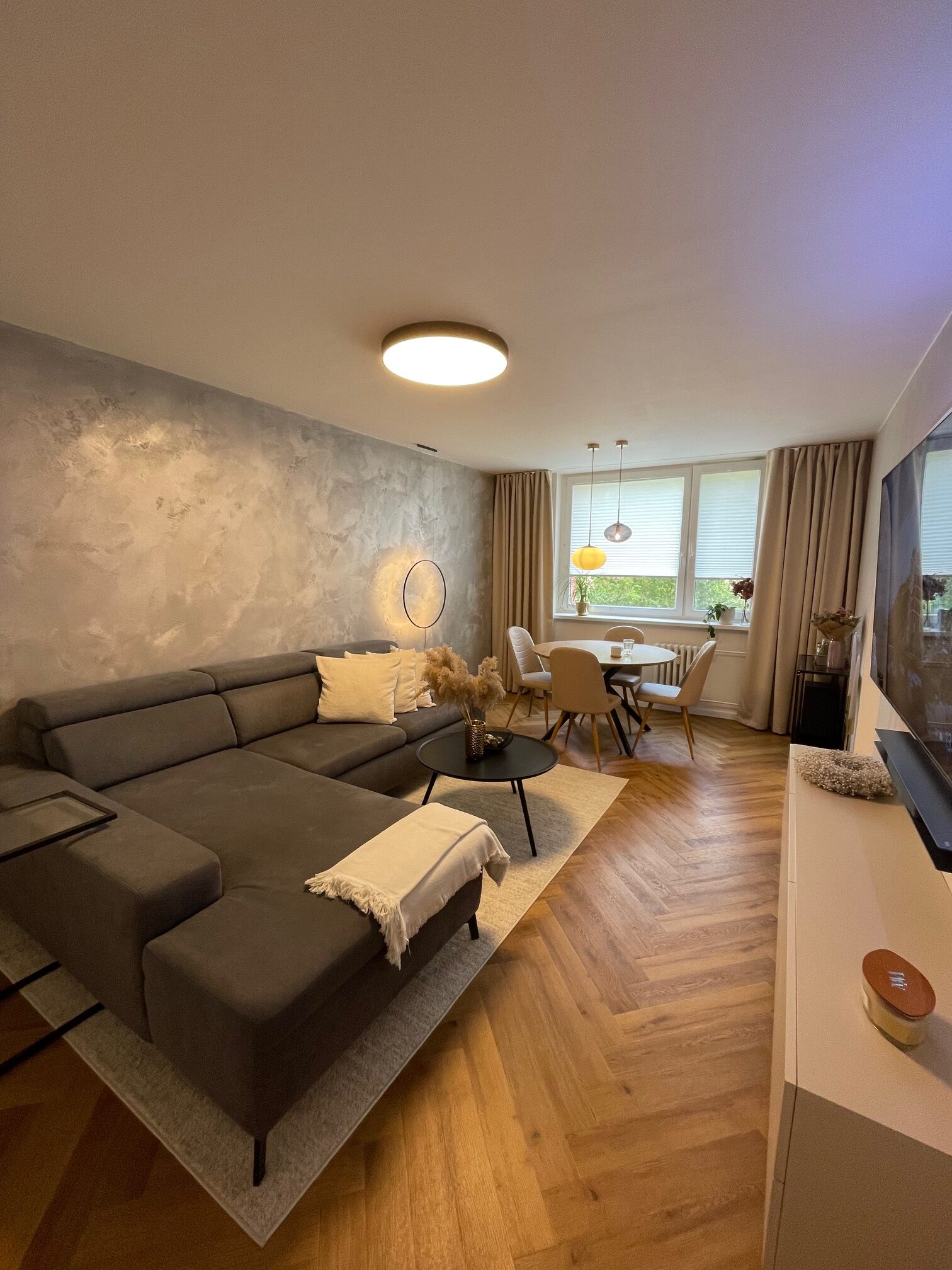 Tento starší byt rekonstruoval mladý pár. Navrhovala jsem kuchyni, obývací pokoj, koupelnu, toaletu, chodbu a ložnici. Speciálním přáním, zde byl návrh rumové skříňky. Dominantou v prostoru je podlaha s moderní „stromečkovou“ vazbou, která je v celém bytě, kromě koupelny a toalety. Celý byt je pojat ve světlých přírodních tónech s doplňky zlaté a černé. V obývacím pokoji je za sedací soupravou natáhnuta stěrka v šedém tónu. V koupelně je ještě zopakován vzor stromečku ve skladbě obkladu za vanou. Obdelníkové obklady jsou pak použity i za pracovní deskou v kuchyni. Ta je volena z kompaktu a umožnila použití praktického podstavného dřezu.