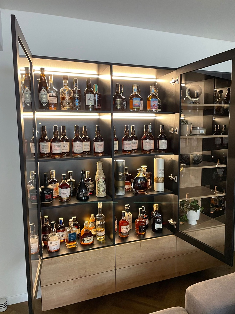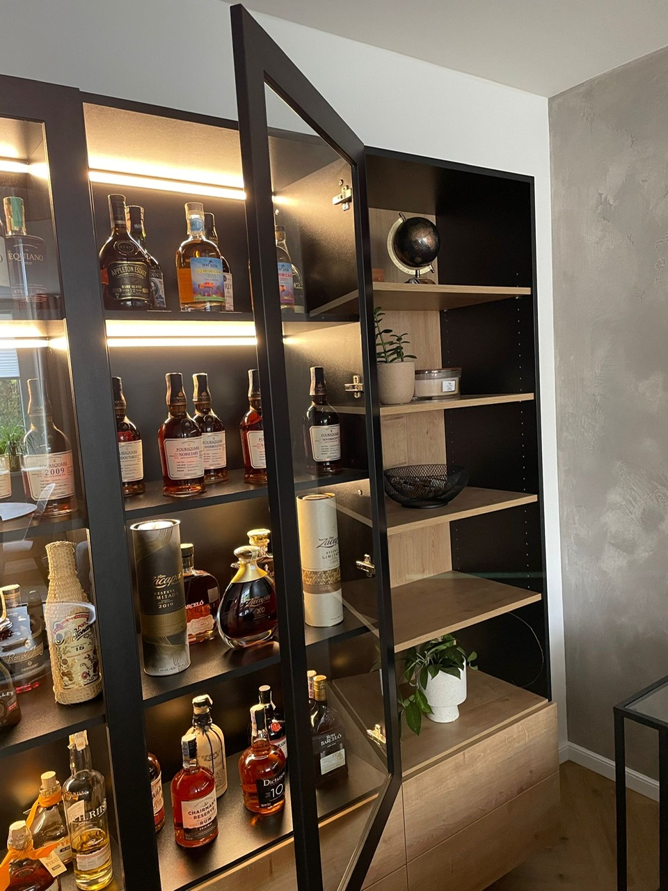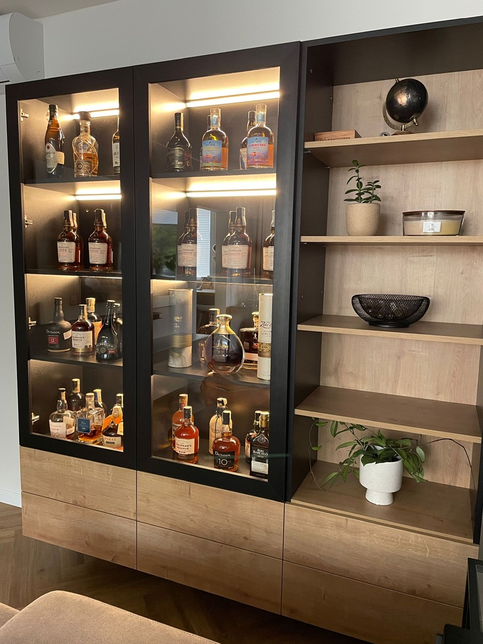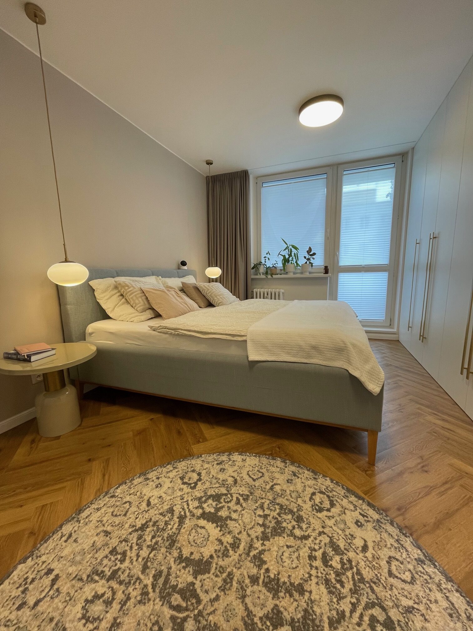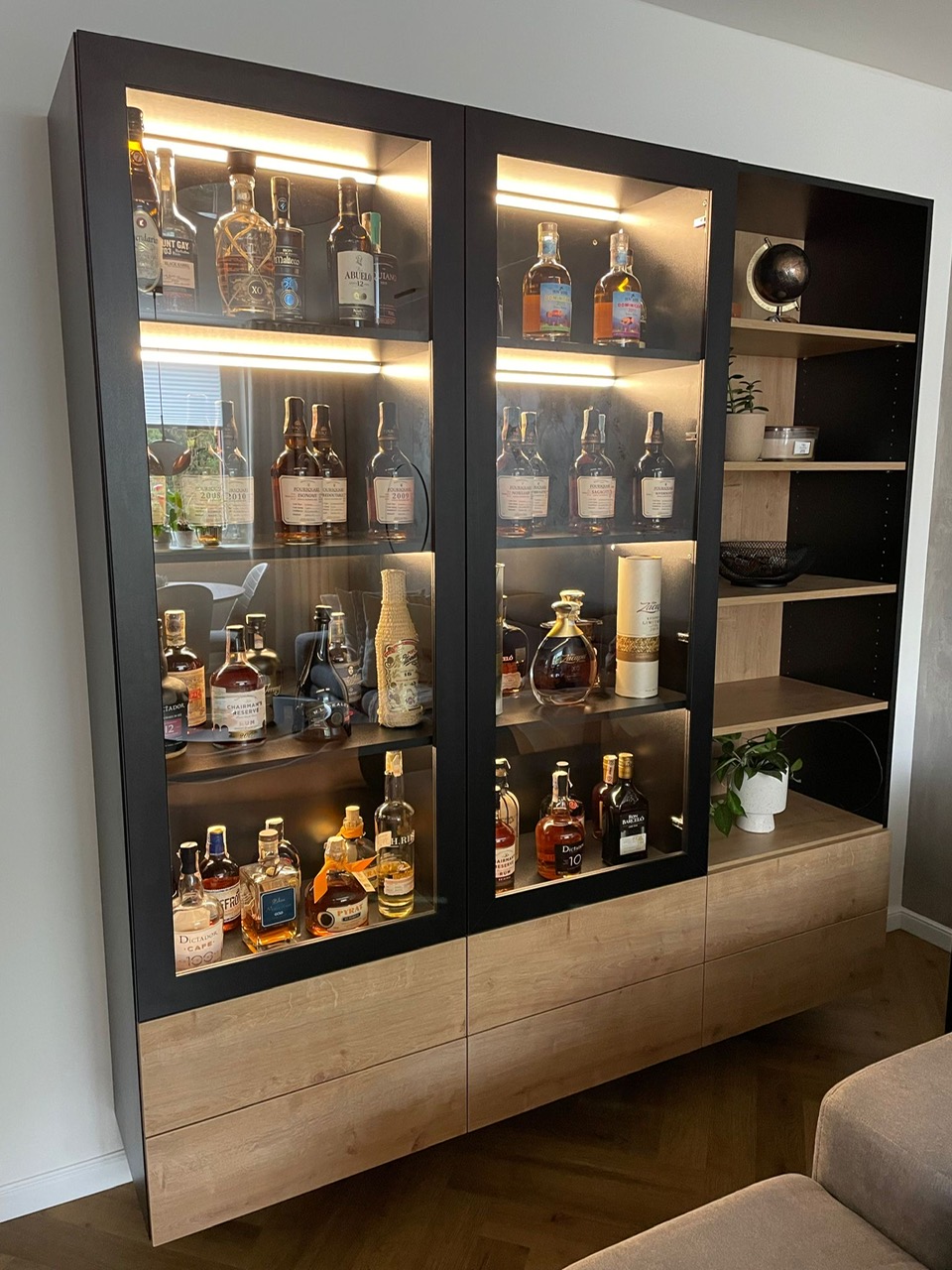 Tento starší byt rekonstruoval mladý pár. Navrhovala jsem kuchyni, obývací pokoj, koupelnu, toaletu, chodbu a ložnici. Speciálním přáním, zde byl návrh rumové skříňky. Dominantou v prostoru je podlaha s moderní „stromečkovou“ vazbou, která je v celém bytě, kromě koupelny a toalety. Celý byt je pojat ve světlých přírodních tónech s doplňky zlaté a černé. V obývacím pokoji je za sedací soupravou natáhnuta stěrka v šedém tónu. V koupelně je ještě zopakován vzor stromečku ve skladbě obkladu za vanou. Obdelníkové obklady jsou pak použity i za pracovní deskou v kuchyni. Ta je volena z kompaktu a umožnila použití praktického podstavného dřezu.